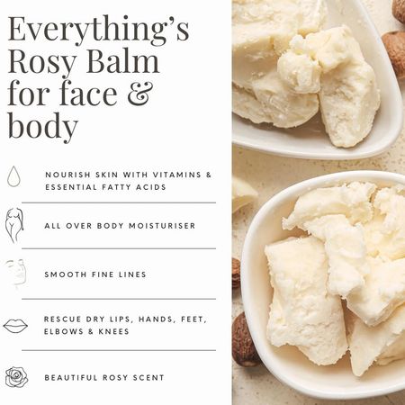 Rosy Balm is an all-in-one hero product for nourished, radiant, smoothed & protected skin from top to toe! Hand crafted with care using a blend of high quality ingredients, this rosy scented balm is light, easily absorbed, and has a velvety finish - no greasy residue!